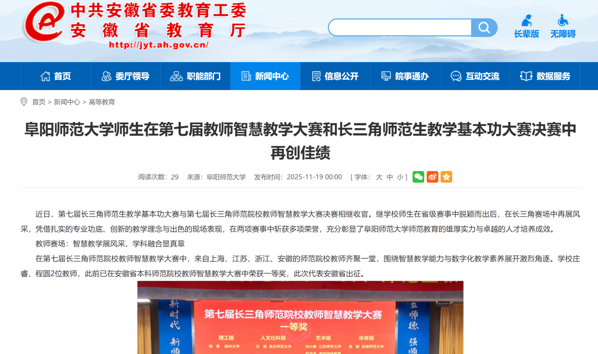 11月19日,安徽教育网报道:阜阳师范大学师生在第七届教师智慧教学大赛和长三角师范生教学基本功大赛决赛中再创佳绩。文章地址:https://jyt.ah.gov.cn/xwzx/gdjy/40773176.html