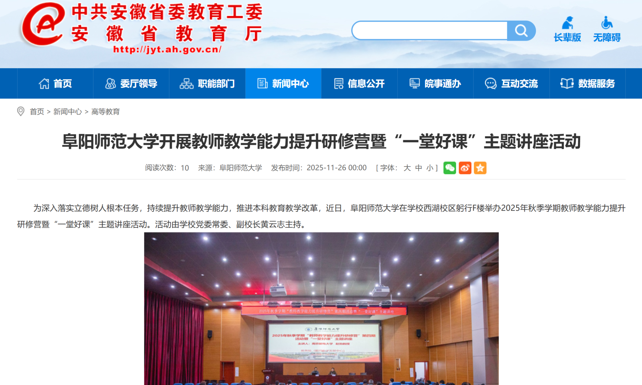 11月26日,安徽教育网报道:阜阳师范大学开展教师教学能力提升研修营暨“一堂好课”主题讲座活动。文章地址: