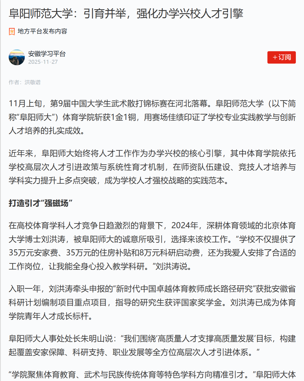 11月27日,“学习强国”安徽学习平台报道:阜阳师范大学:引育并举,强化办学兴校人才引擎。文章地址:https://article.xuexi.cn/articles/index.html?art_id=3691851984494832117&cdn=https%3A%2F%2Fregion-anhui-resource&item_id=3691851984494832117&study_style_id=feeds_opaque&t=1764205338907&showmenu=false&ref_read_id=fdbd27f2-407d-4d27-a8a4-73a3f4eba984&pid=&ptype=-1&source=share&share_to=wx_single