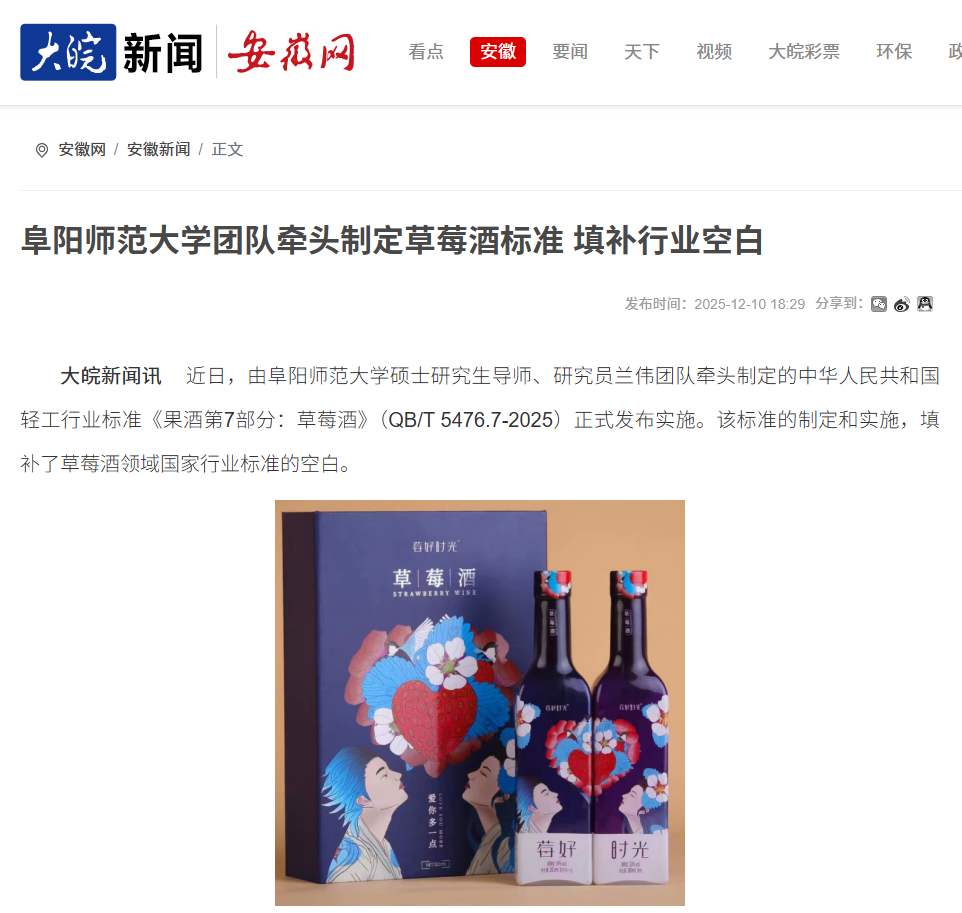 12月10日,大皖新闻客户端报道:阜阳师范大学团队牵头制定草莓酒标准 填补行业空白。文章地址: