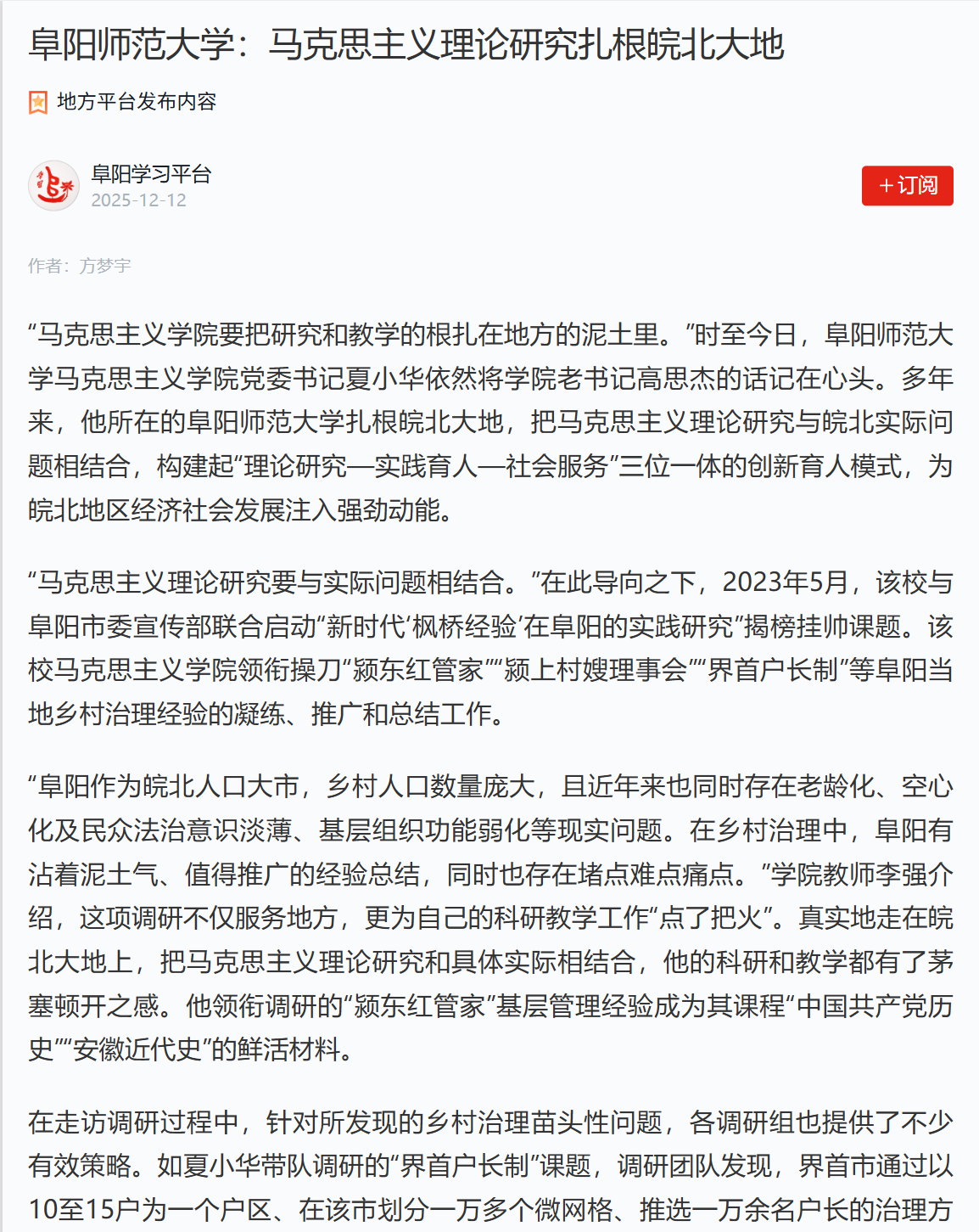 12月12日,“学习强国”阜阳学习平台报道:阜阳师范大学:马克思主义理论研究扎根皖北大地。文章地址:https://article.xuexi.cn/articles/index.html?art_id=10217707726352355136&cdn=https%3A%2F%2Fregion-anhui-resource&item_id=10217707726352355136&study_style_id=feeds_opaque&t=1765530583754&showmenu=false&ref_read_id=3ba73b98-f83e-42c4-809b-a6ed8c91d90e_1765933614041&pid=&ptype=-1&source=share&share_to=wx_single