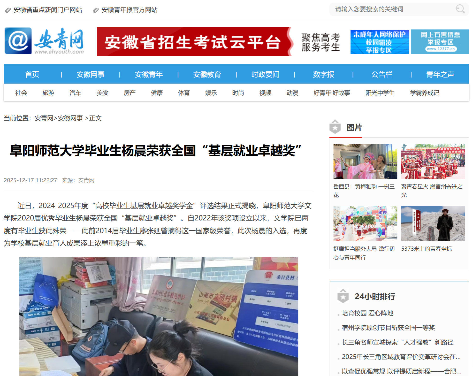 12月17日,安青网报道:阜阳师范大学毕业生杨晨荣获全国“基层就业卓越奖”。文章地址