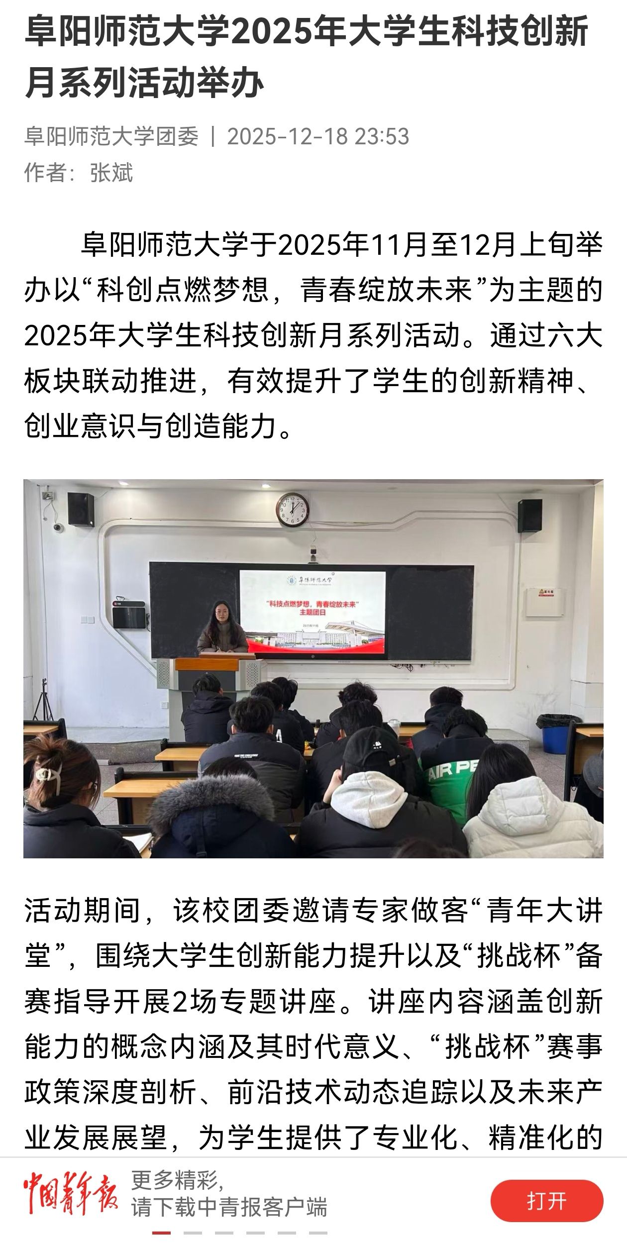12月18日,中国青年报客户端报道:阜阳师范大学2025年大学生科技创新月系列活动举办。文章地址:https://s.cyol.com/articles/2025-12/18/content_gGMJwaSz.html?gid=PDEAGwD9