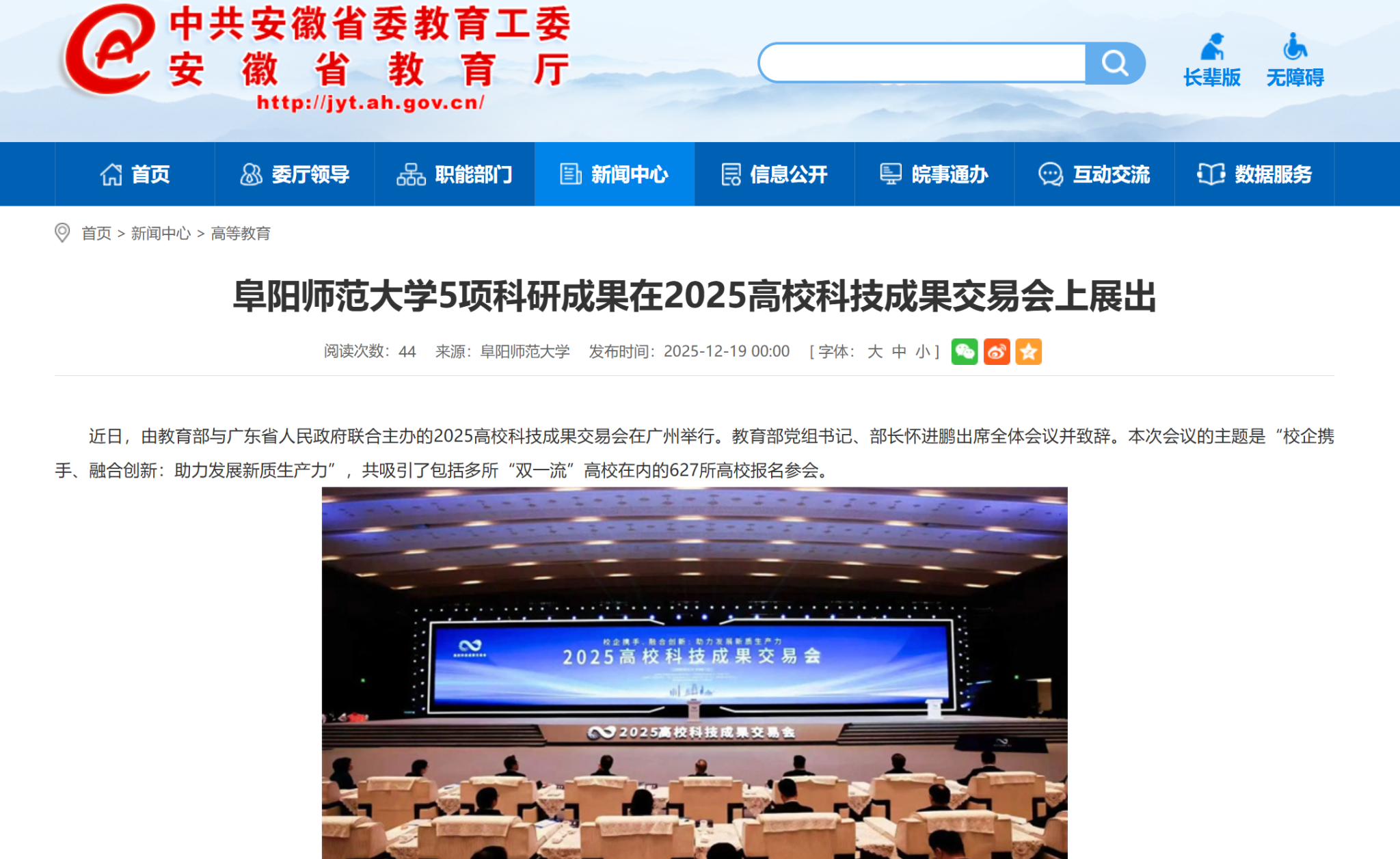 12月19日,安徽教育网报道:阜阳师范大学5项科研成果在2025高校科技成果交易会上展出。文章地址: