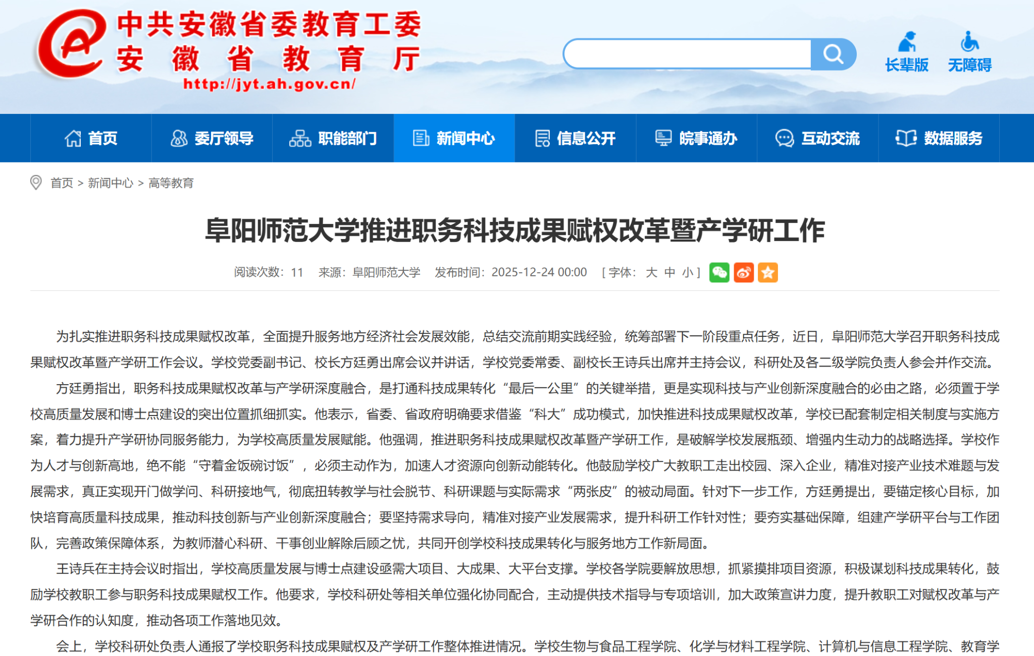 12月24日,安徽教育网报道:阜阳师范大学推进职务科技成果赋权改革暨产学研工作。文章地址: