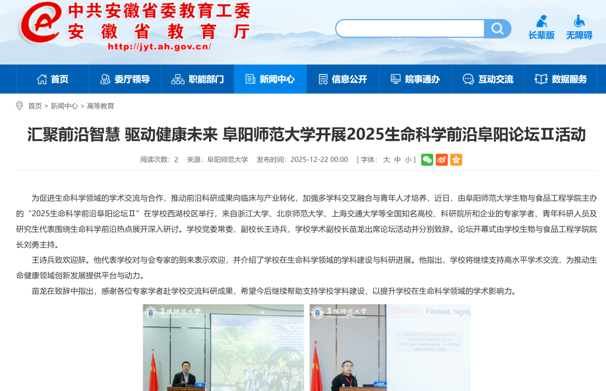 12月22日,安徽教育网报道:汇聚前沿智慧 驱动健康未来 阜阳师范大学开展2025生命科学前沿阜阳论坛Ⅱ活动。文章地址:https://jyt.ah.gov.cn/xwzx/gdjy/40777262.html