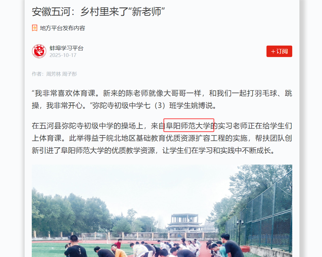 10月17日,学习强国“蚌埠学习平台”报道:安徽五河:乡村里来了“新老师”。文章地址:https://article.xuexi.cn/articles/index.html?art_id=4978106703351171040&t=1760698285729&showmenu=false&cdn=https%3A%2F%2Fregion-anhui-resource&study_style_id=feeds_opaque&source=share&share_to=wx_single&item_id=4978106703351171040&ref_read_id=7f6c5547-856c-4e9f-a814-1a6224638c1b_1762956476740