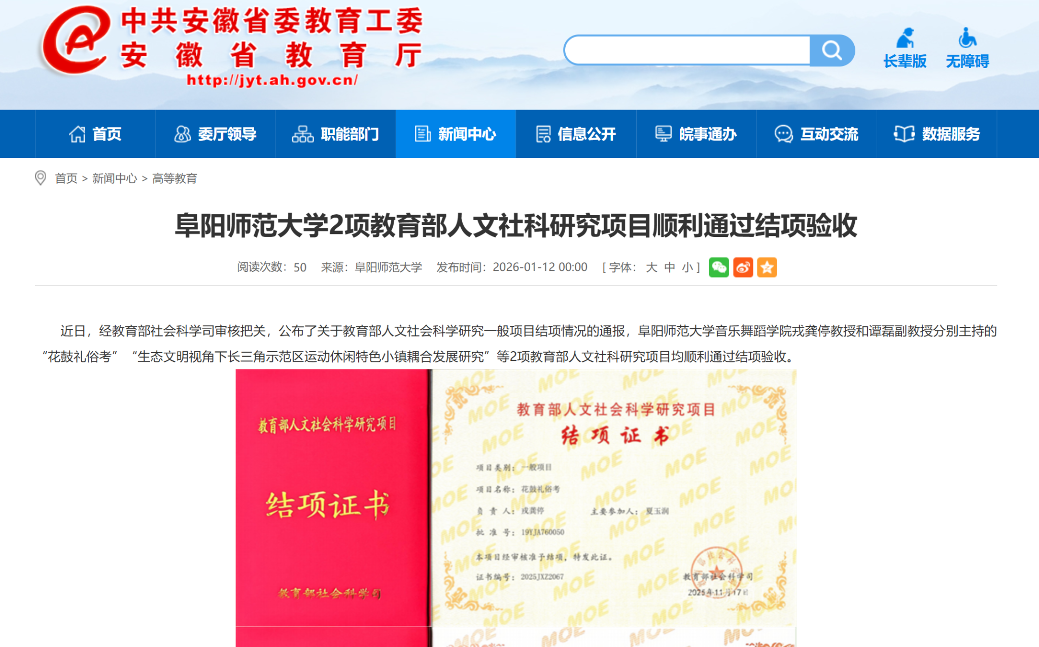 1月12日, 安徽教育网报道:阜阳师范大学2项教育部人文社科研究项目顺利通过结项验收。文章地址: