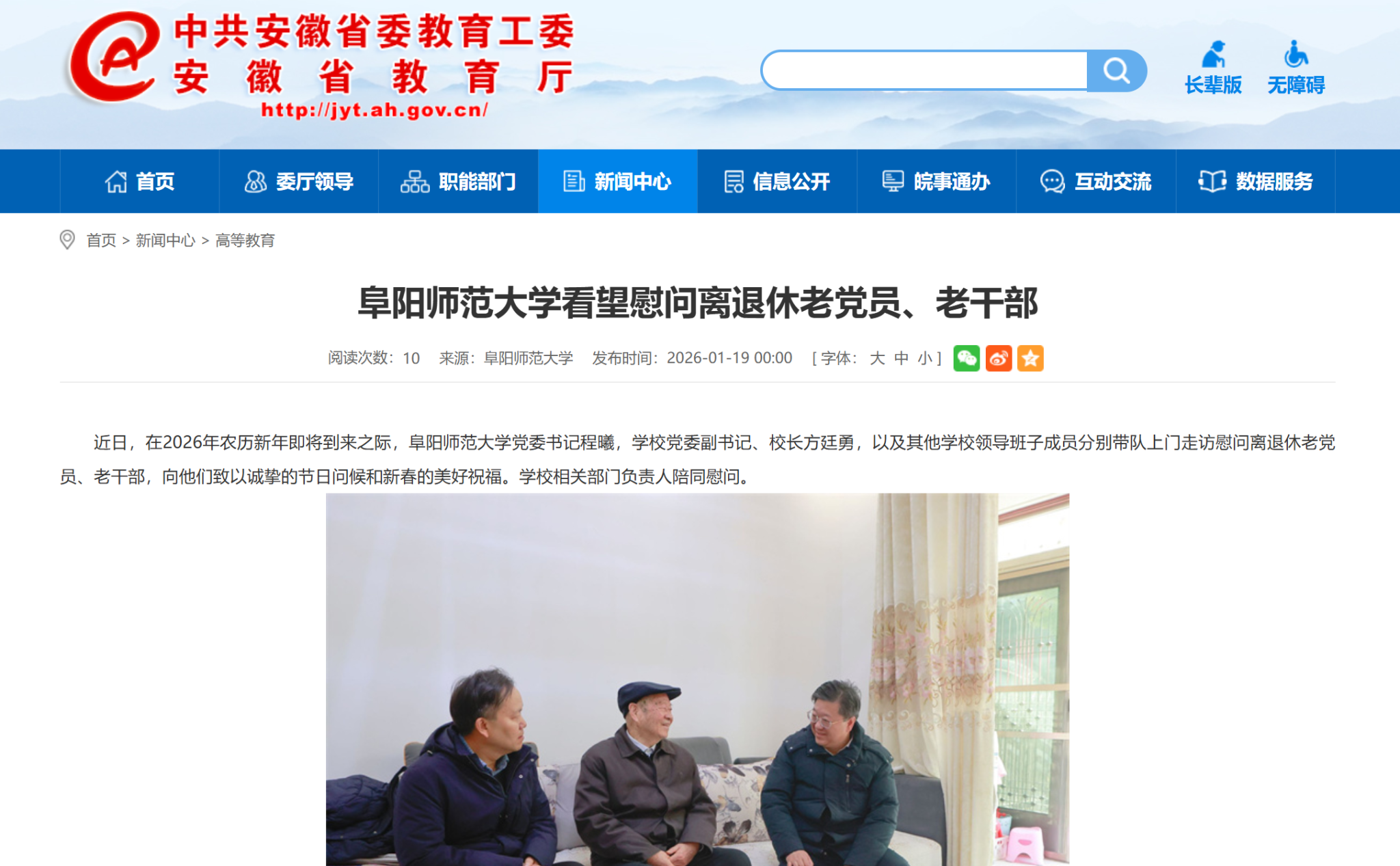 1月19日,安徽教育网报道:阜阳师范大学看望慰问离退休老党员、老干部。文章地址: