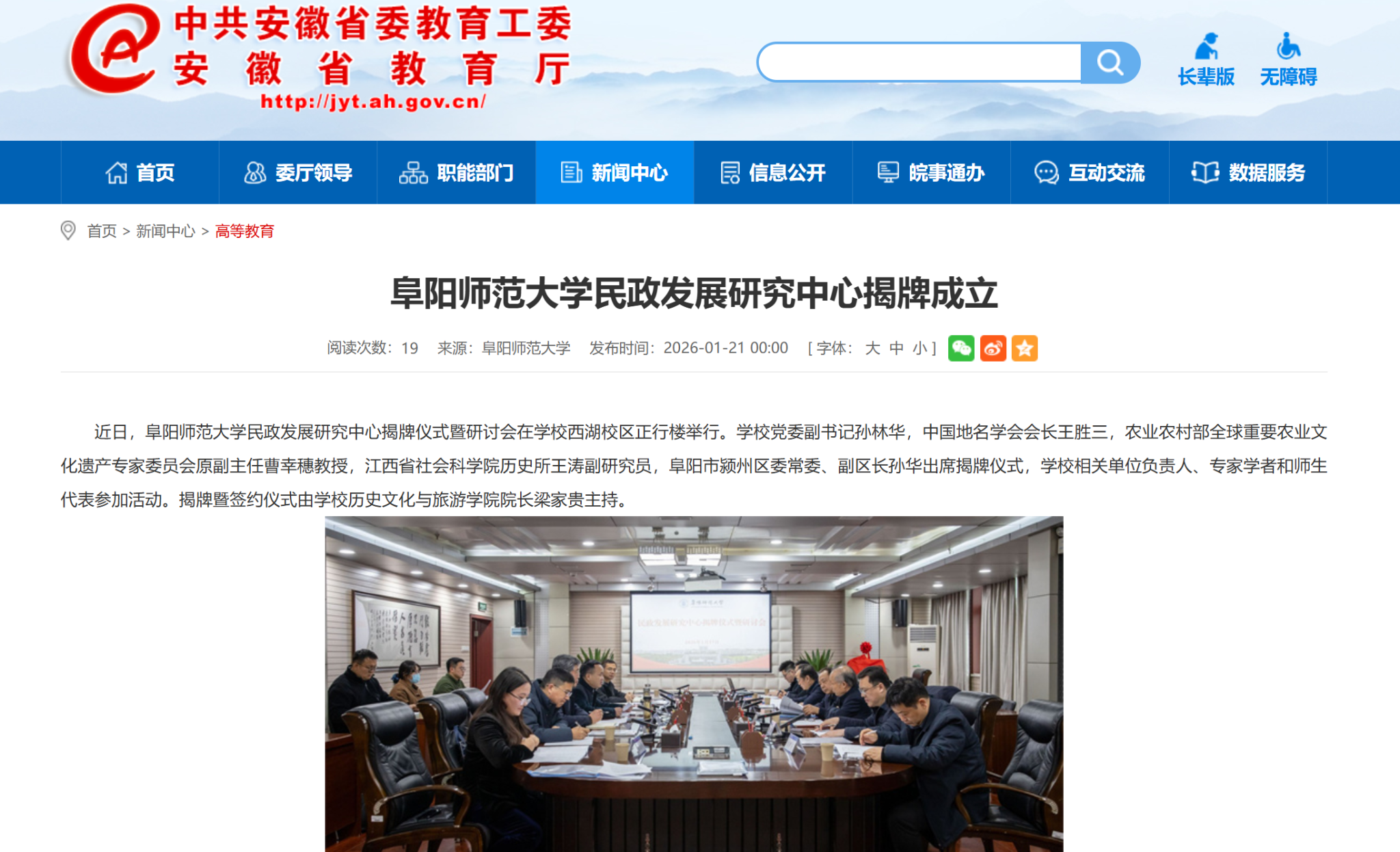 1月21日,安徽教育网报道:阜阳师范大学民政发展研究中心揭牌成立。文章地址: