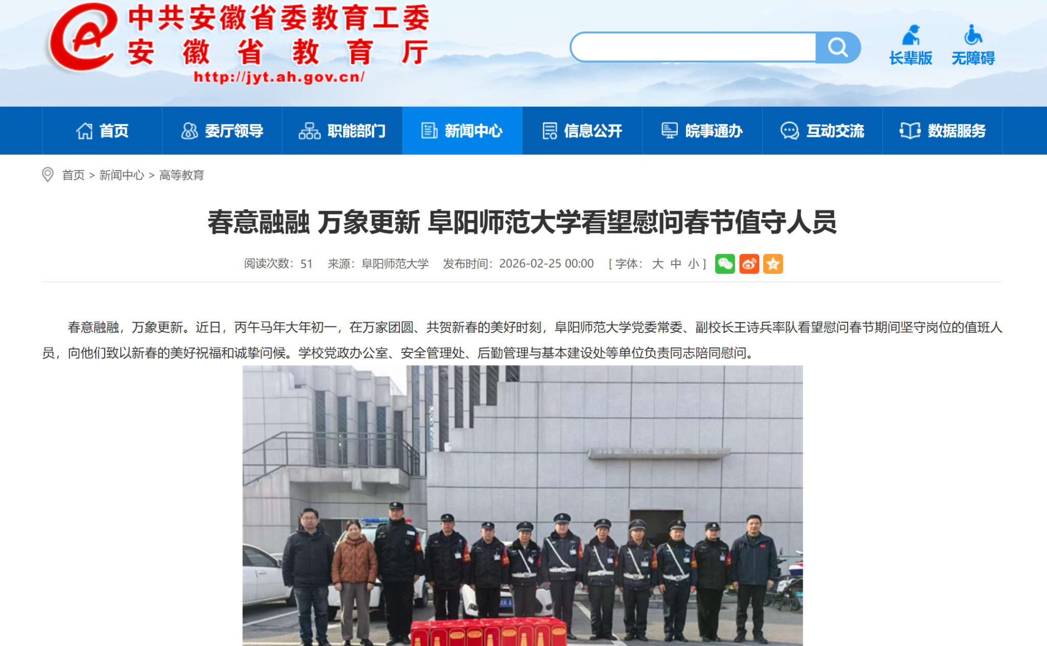 安徽教育网报道:春意融融 万象更新 阜阳师范大学看望慰问春节值守人员