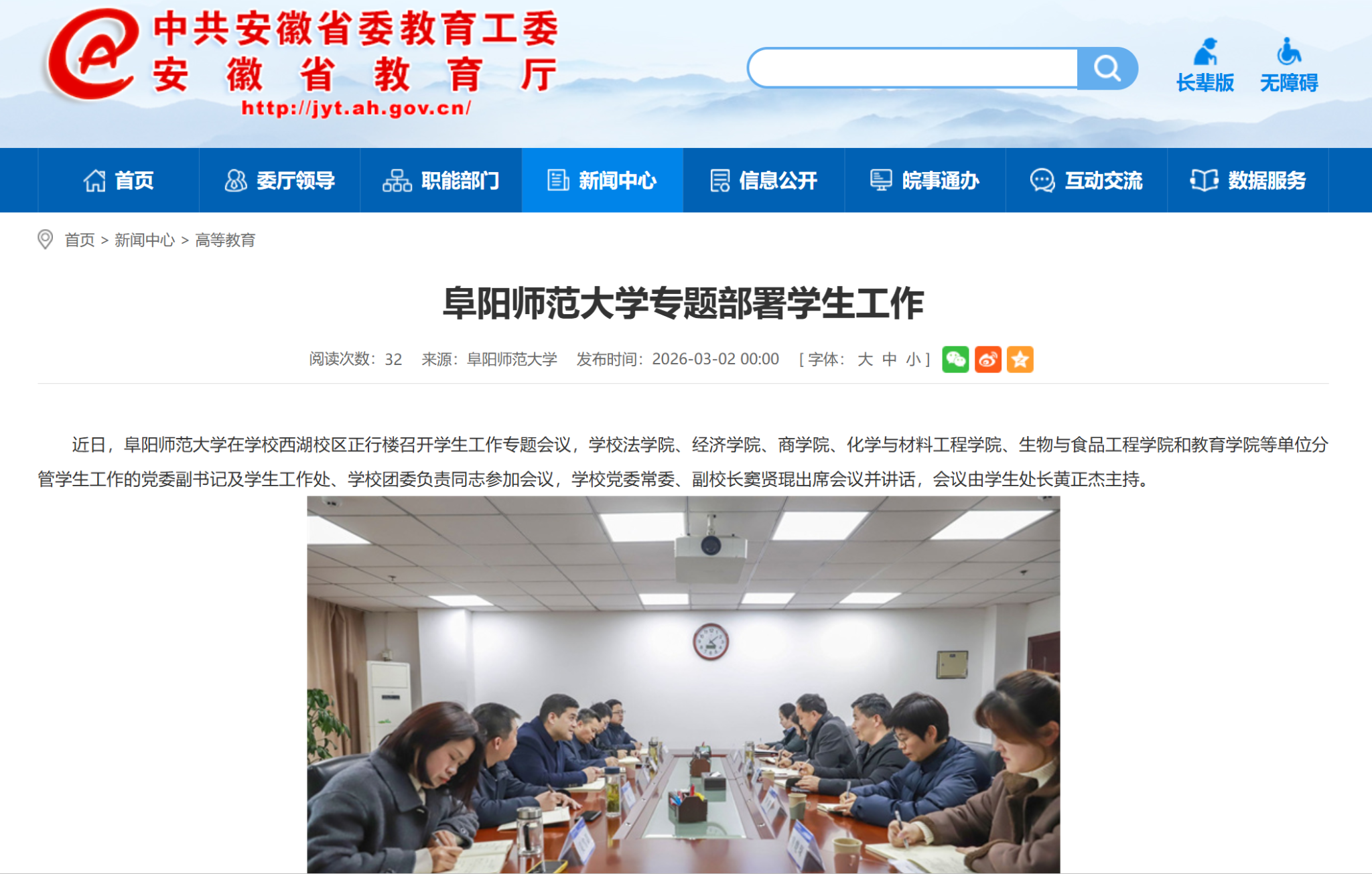 3月2日,安徽教育网报道:阜阳师范大学专题部署学生工作。文章地址: