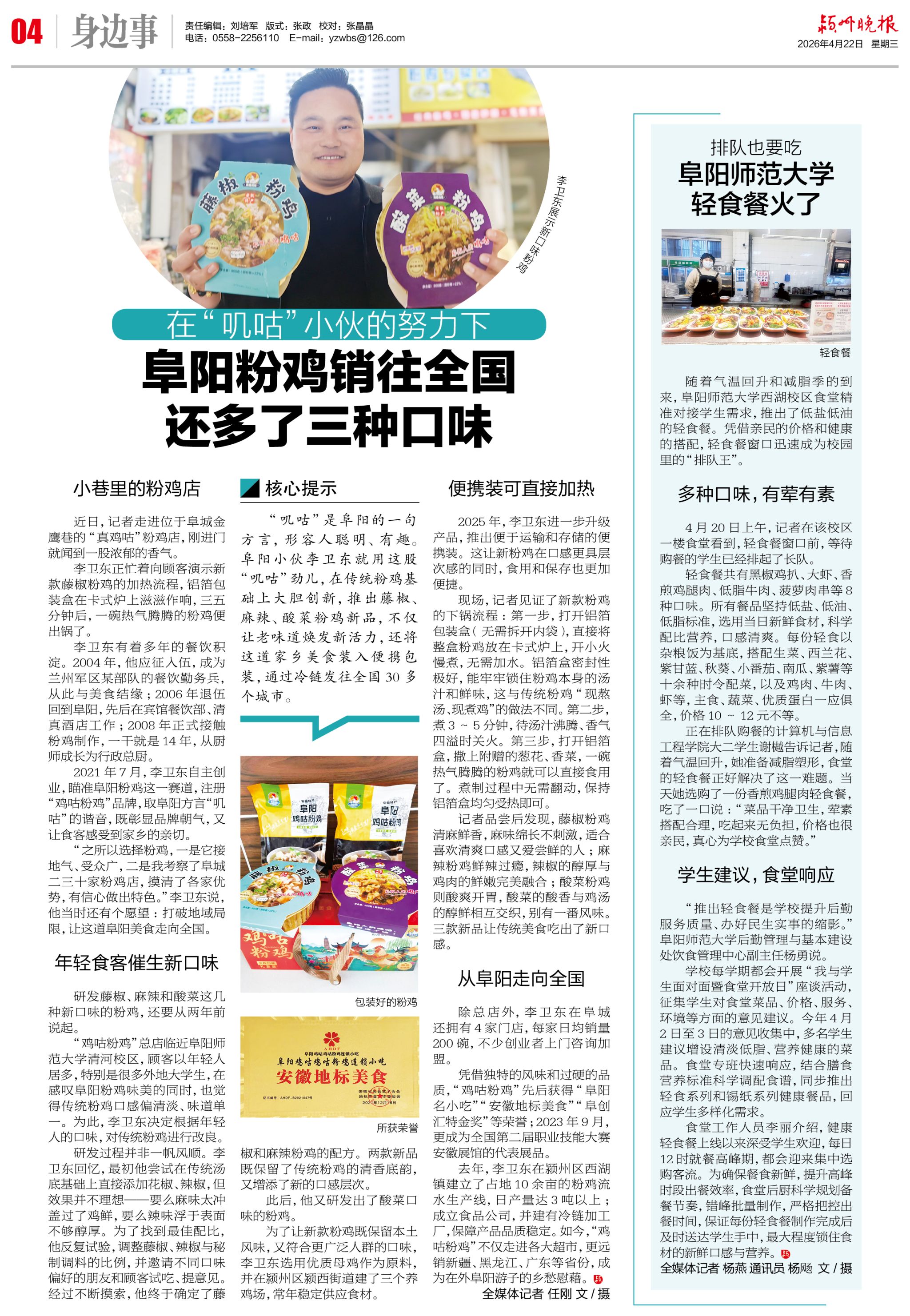 4月22日,颍州晚报报道:阜阳师范大学轻食餐火了。文章地址:http://test.fynews.net/epaper/read.do?m=i&iid=4577&eid=39250&sid=133958&idate=2_2026-04-22