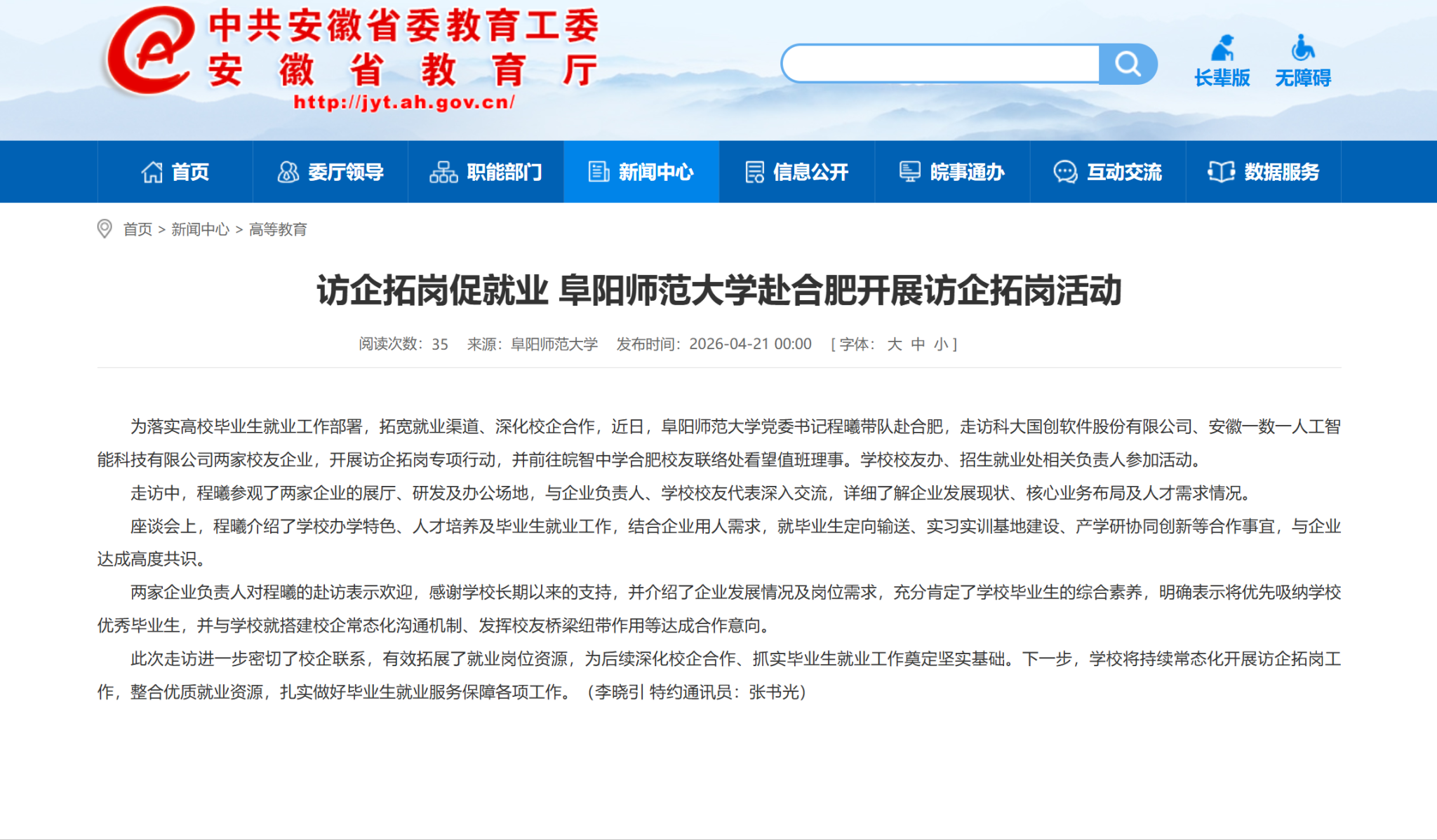 安徽教育网报道:访企拓岗促就业 阜阳师范大学赴合肥开展访企拓岗活动