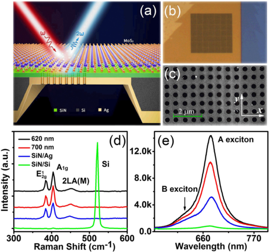 Figure 1: (a) Schematic of our designed sample for detecting second-harmonic generation (SHG) signal. (b) Optical microscope image of the sample with the size of 21.7μm × 21.7μm. (c) Scanning electron micrograph (SEM) of the structure with P = 620 nm, respectively. (d) The Raman spectra and (e) PL spectra of monolayer MoS2 on the different substrates.
