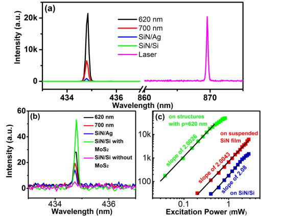 Figure 3. Nonlinear SHG microscopy. (a) SHG spectra of monolayer MoS2 on the different substrates (metallic structures with P = 620 nm (black) and P = 700 nm (red), SiN/Ag (blue) and SiN/Si (green) substrate) and typical spectrum (pink) of fundamental laser. (b) SHG spectra of the different substrates without monolayer MoS2. As a reference, SHG spectrum (green line) of the SiN/Si substrate with monolayer MoS2 is also plotted in (b). (c) The dependence of the SHG intensity from monolayer MoS2 on different substrates on the excitation power plotted in log-log scale. Quadratic linear fit is displayed by the black line.