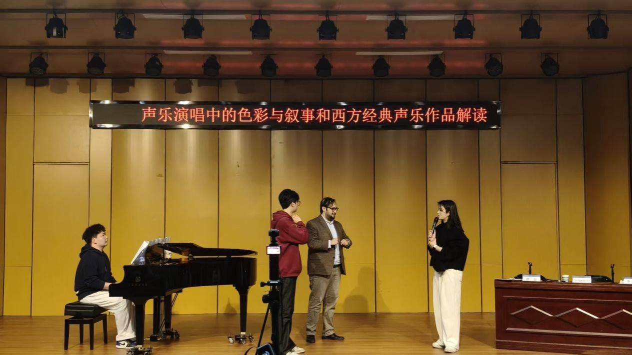 桑特利塞斯博士从声乐演唱中“声音的色彩塑造”与“作品的叙事逻辑”两个核心维度展开讲解,现场对4名学生逐一进行指导,并结合自身丰富的舞台经验,多次进行现场示范演唱,直观展现西方经典声乐作品的艺术处理方式。