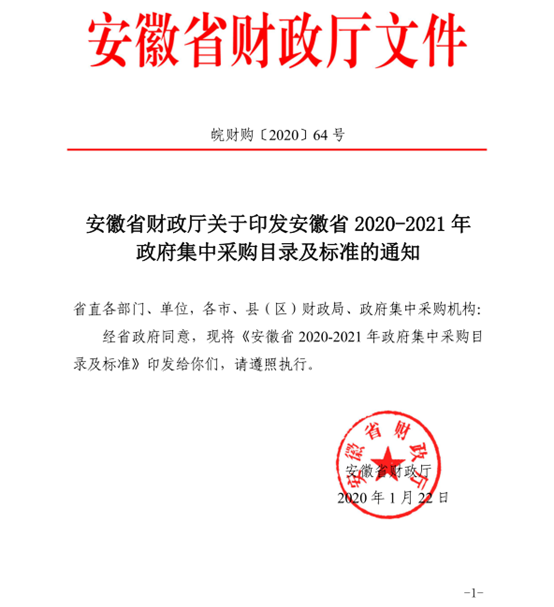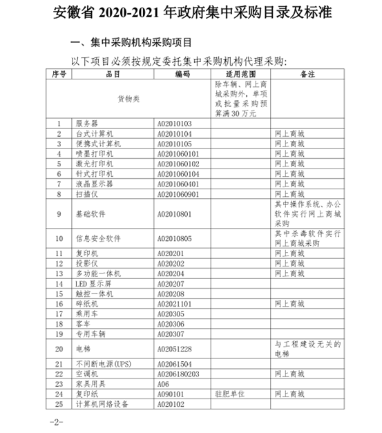 安徽省财政厅关于印发安徽省2020-2021年政府集中采购目录及标准的通知(皖财购〔2020〕64号)