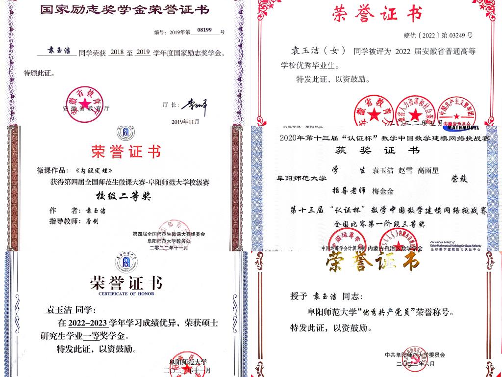 曾获国家励志奖学金3次,优秀学生一等奖学金2次,三好学生4次,优秀学生二等奖学金、校长奖学金、自胜奖学金、优秀班干部、优秀干事各1次;省级、校级优秀毕业生;各级别证书累计40余张,其中国家级6项,省级4项,校级25项。