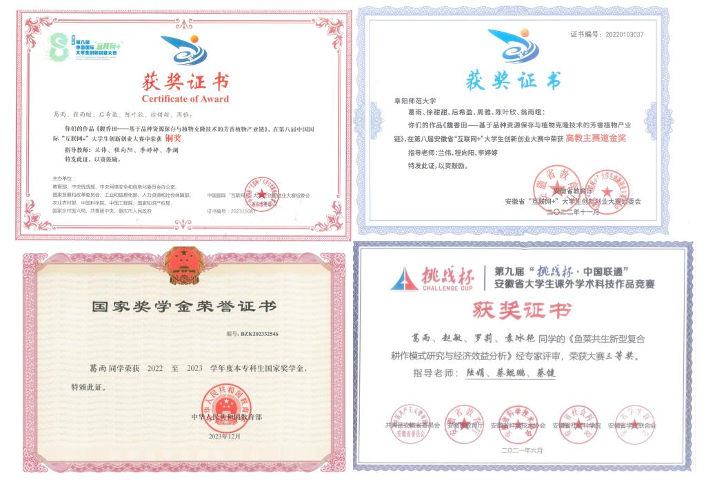 葛雨大学期间担任班级班长一职,曾获得国家奖学金、优秀学生一等奖学金,安徽省优秀高等学校毕业生、优秀标兵、三好学生等荣誉,第九届“挑战杯·华安证券”安徽省大学生课外学术科技作品竞赛省级铜奖、第八届安徽省“互联网+”大学生创新创业大赛省级金奖、获第八届中国国际“互联网+”大学生创新创业大赛国家级铜奖等奖项。