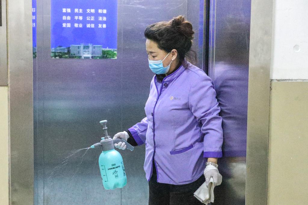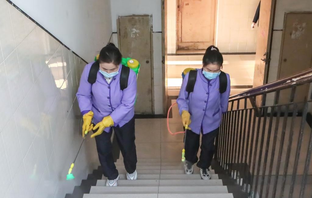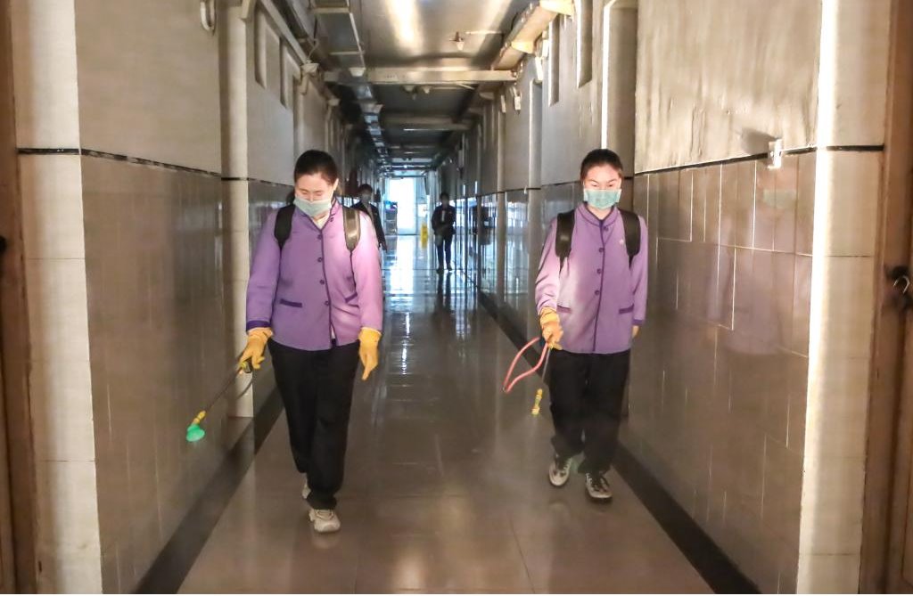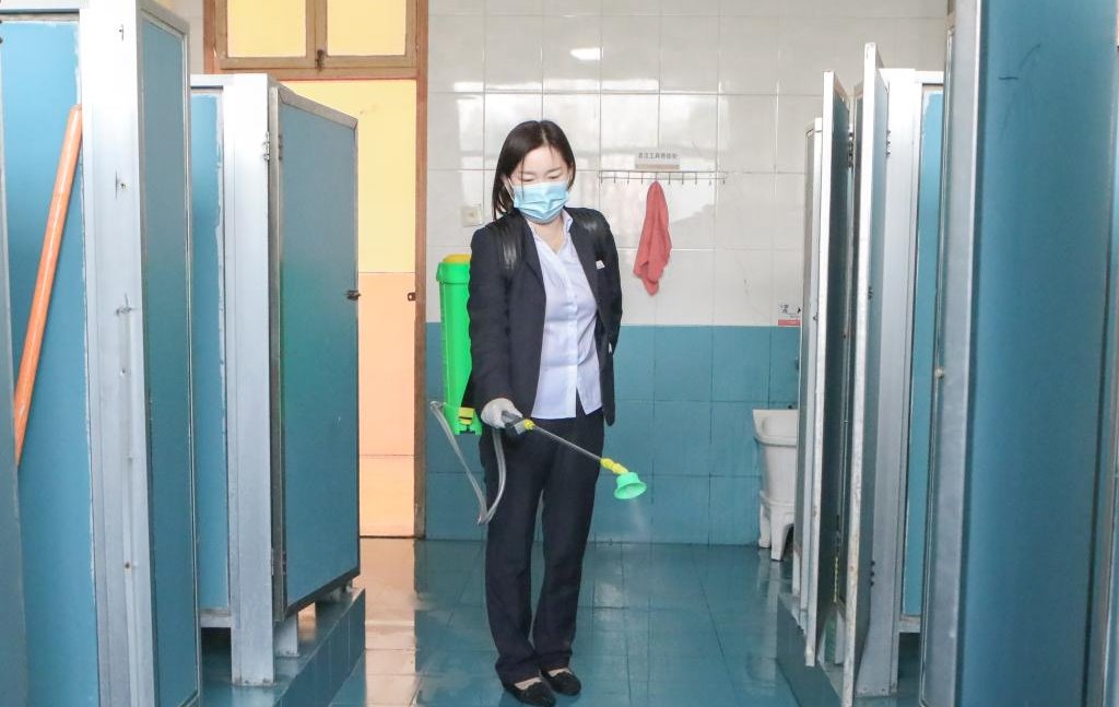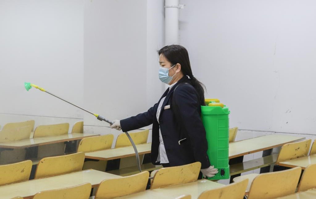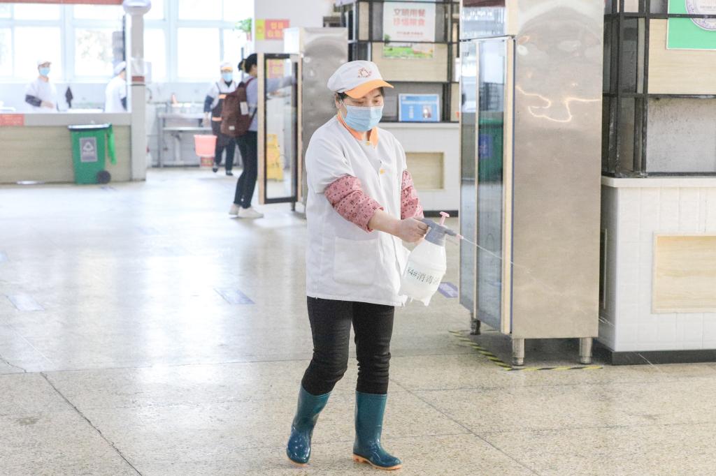 消杀过程中,后勤服务集团组织专业消毒人员采用雾状喷洒的方法分别对学校教室、宿舍、食堂、图书馆等公共区域进行全区域立体式消毒灭菌,重点对桌椅、门把手、楼道、洗手间、电梯轿厢、垃圾桶等关键区域、关键点实施密集消毒灭菌。通过近三个小时的持续作业,全面完成了校园内所有公共区域的消杀任务。