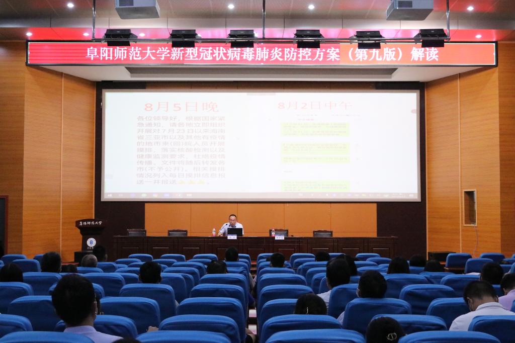 为深入贯彻落实《新型冠状病毒肺炎防控方案(第九版)》要求,全面提升学校常态化疫情防控能力和水平,8月23日上午,学校举办2022年秋季学期疫情防控专题培训会,邀请阜阳市疾控中心主任孙良博士作专题辅导。