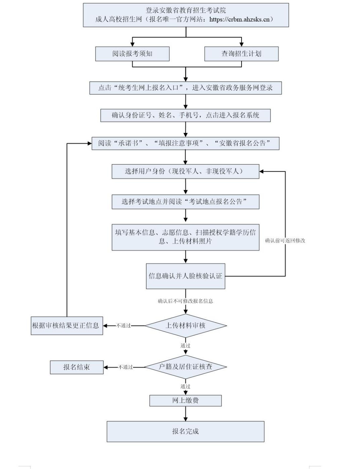考生如出现因使用非官方网址或不符合报名条件和要求、由他人或机构代为报名、提供虚假材料、手机号码错误无法联络等情况,导致不能考试、录取和学籍注册的,责任由考生自负。如涉嫌伪造身份证、居住证、学历证明等有关材料,将依法追究考生及相关人员责任。