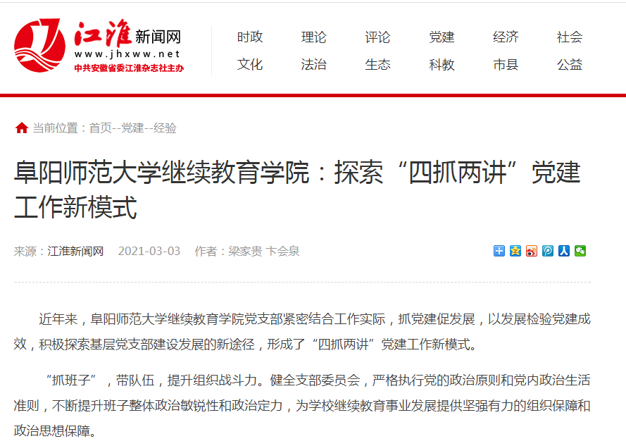 3月3日,中共安徽省委江淮杂志社主办的江淮新闻网以《阜阳师范大学继续教育学院:探索“四抓两讲”党建工作新模式》为题,报道我校继续教育学院党支部探索党建工作新模式。