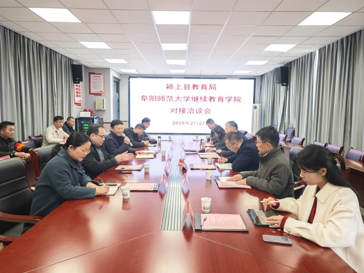 2025年2月27日,院长王健带队赴颍上县开展基础教育教师专业发展需求调研,副院长王胜、培训科有关工作人员随同前往。调研组在实地走访颍上县附属学校后,于附属小学会议室召开了对接洽谈会。会议由颍上县委教育工委委员、县教研室主任胡继军主持。颍上县教育局教师进修学校校长张福臣、附属学校校长刘尤春等相关人员参会。