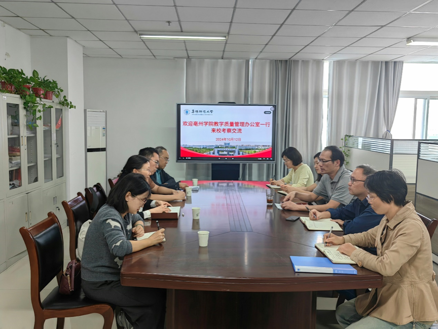 1012午,亳州学院教学质量管理办公室主任、教务处副处长沈晓燕以及实践教学科陈夫进、教务科郭青欣和督导科凌梅一行4来我校教学质量管理处考察交流。双方就本科教学质量监测体系建设、教学督导管理运行开展了工作交流。