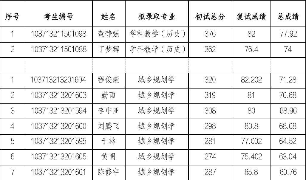 根据教育部《关于印发<2023年全国硕士研究生招生工作管理规定>的通知》(教学〔2022〕3号)、《关于做好2023年全国硕士研究生复试录取工作的通知》(教学司〔2023〕3号)和安徽省高等学校招生委员会 安徽省教育厅《关于做好安徽省2023年硕士研究生复试录取工作的通知》(皖招委〔2023〕4号)等文件精神,按照安徽省2023年硕士研究生招生录取工作会议要求、阜阳师范大学历史文化与旅游学院2023年硕士研究生复试录取工作方案。现将我院2023年学科教学(历史)、城乡规划学专业第一志愿全日制硕士研究生拟录取名单公示如下:
