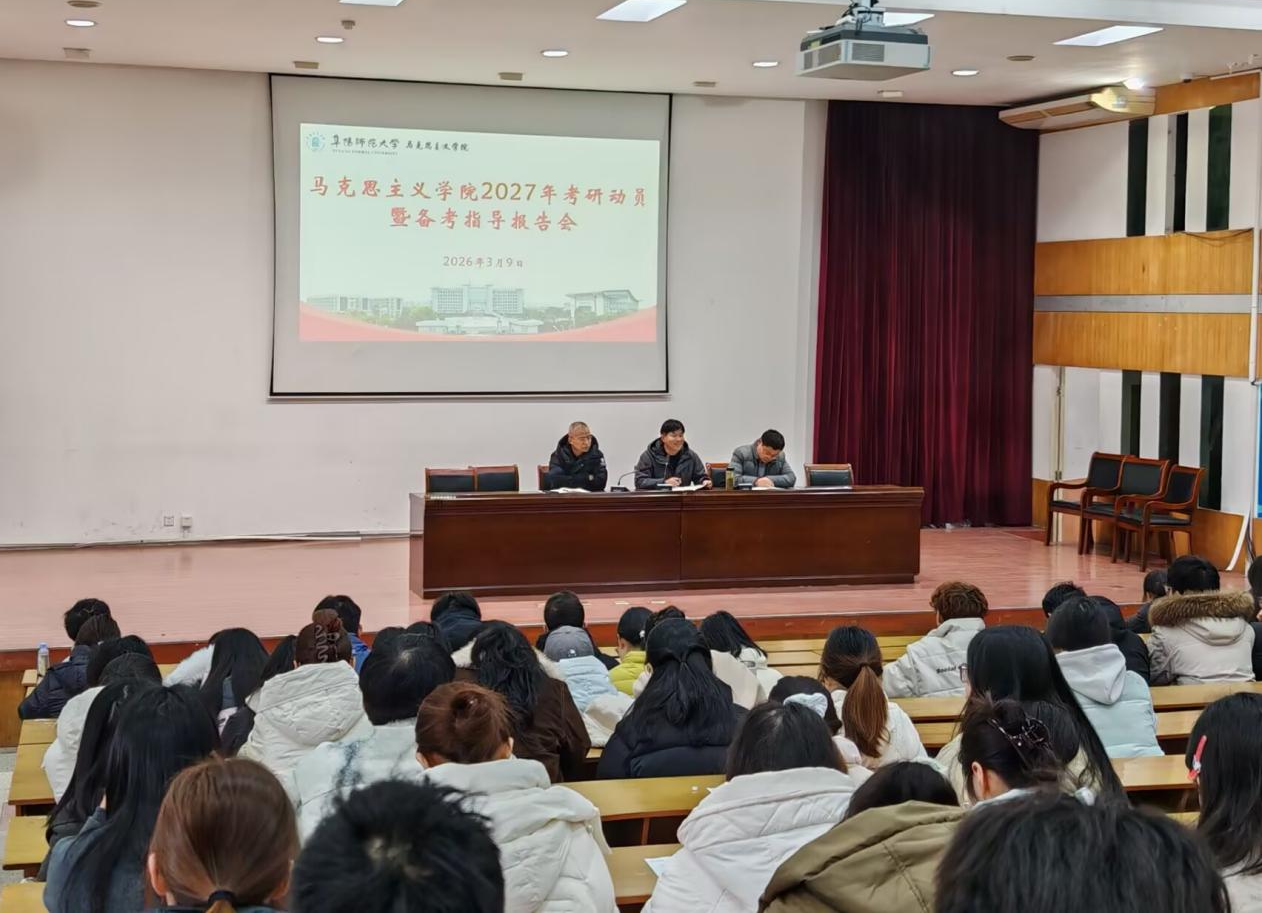 为积极应对当前就业形势,进一步提升学生升学深造比例与就业竞争力,助力学子明确升学目标、科学备战考研,3月9日,马克思主义学院召开2027年考研动员会暨备考指导会。学院党委书记夏小华、院长朱宗友、党委副书记徐朝东及全体2023级本科生参加会议,会议由徐朝东主持。