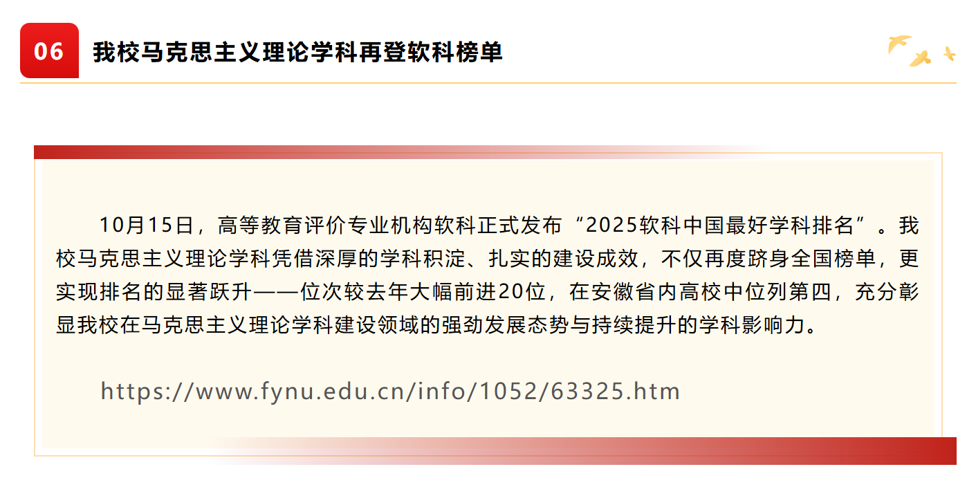 近日,阜阳师范大学2025年度“十大新闻”评选结果揭晓。经网络投票、专家评审等环节,“我校马克思主义理论学科再登软科榜单”成功入选,成为本年度“十大新闻”之一。
