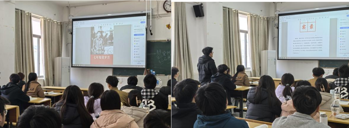 课前,由各班班长、学习委员或思政委员担任领读人,带领全班同学诵读原文、品读故事,重温青年习近平扎根基层、实干为民、攻坚克难的奋斗历程,还原青年习近平在梁家河“过五关”(跳蚤关、饮食关、生活关、劳动关、思想关)的真实场景。通过读原著、学原文、悟原理,让学生在沉浸式阅读中感受领袖青年时代的坚定信念与朴素情怀。随后,学生结合自身学习与生活实际,上台分享阅读感悟,从梁家河的知青岁月、正定的改革实践、闽东的脱贫探索中,感悟领袖的人民情怀、责任担当与务实作风。