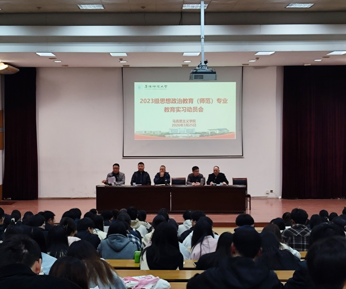 为扎实做好2023级师范生教育实习工作,引导学生明确实习目标、规范实习行为、提升实践能力,切实提升实习工作质量,3月25日晚,马克思主义学院在三里桥校区D楼学术报告厅召开2023级思想政治教育(师范)专业教育实习动员大会。马克思主义学院院长朱宗友、党委副书记徐朝东、副院长赵永明、思政系主任李强、全体实习指导教师及实习学生参加会议。会议由思政教研室主任李涛主持,共设工作部署、学生发言、安全教育、互动交流四个环节,涵盖六项议程。