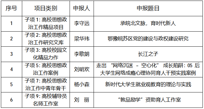 依据《教育部办公厅关于启动2026年度高校思想政治工作质量提升综合改革与精品建设项目申报工作的通知》(教思政厅函〔2026〕1号)和《中共安徽省委教育工委转发教育部办公厅关于启动2026年度高校思想政治工作质量提升综合改革与精品建设项目申报工作的通知》(皖教工委函〔2026〕40号)文件要求,经个人申请、主管部门资格审查、校内专家匿名评审等程序,现将学校拟推荐项目进行公示(公示期为2026年3月18日至2026年3月19日)。