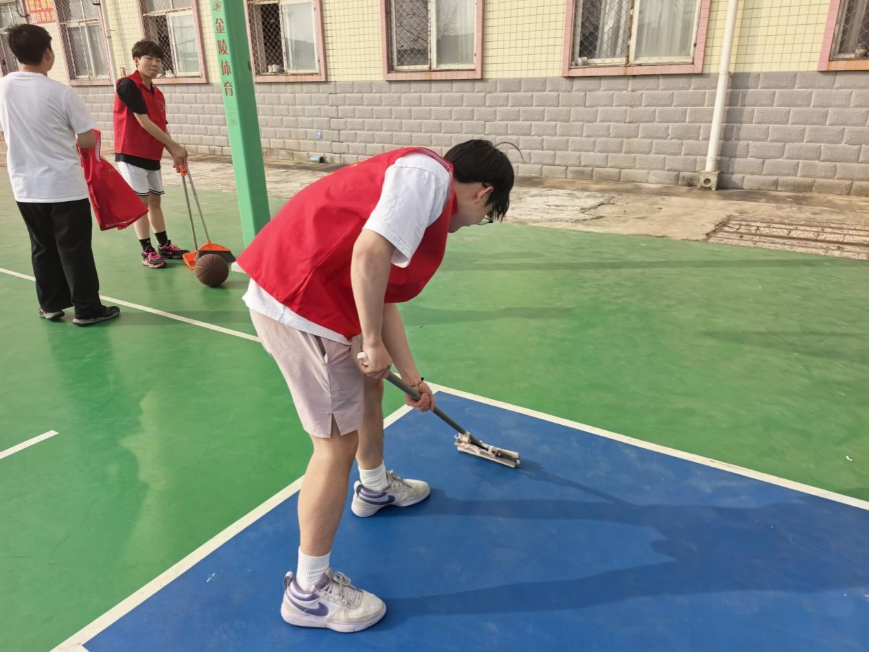 活动现场,志愿者们手持扫帚、簸箕、垃圾袋等清洁工具,迅速集结并分工协作。大家发扬不怕脏、不怕累的精神,对篮球场地面的落叶、灰尘等进行了全面清扫。在清理过程中,同学们不仅关注主场地卫生,更将目光投向台阶缝隙、绿化带深处以及篮球架底座、排水道等容易被忽视的卫生死角,进行了细致入微的彻底清理。经过近半个小时的协同奋战,篮球场及周边区域焕然一新,为全校师生营造了一个更加安全、整洁、舒适的运动空间。