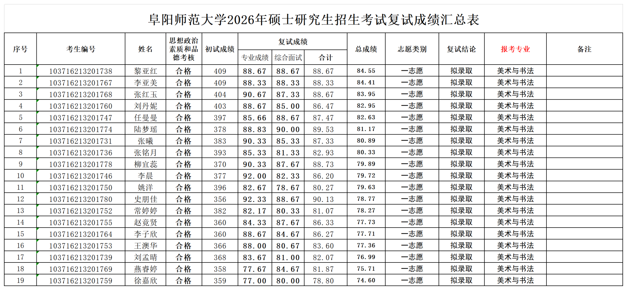 阜阳师范大学美术学院2026年硕士研究生招生考试一志愿复试成绩公示
