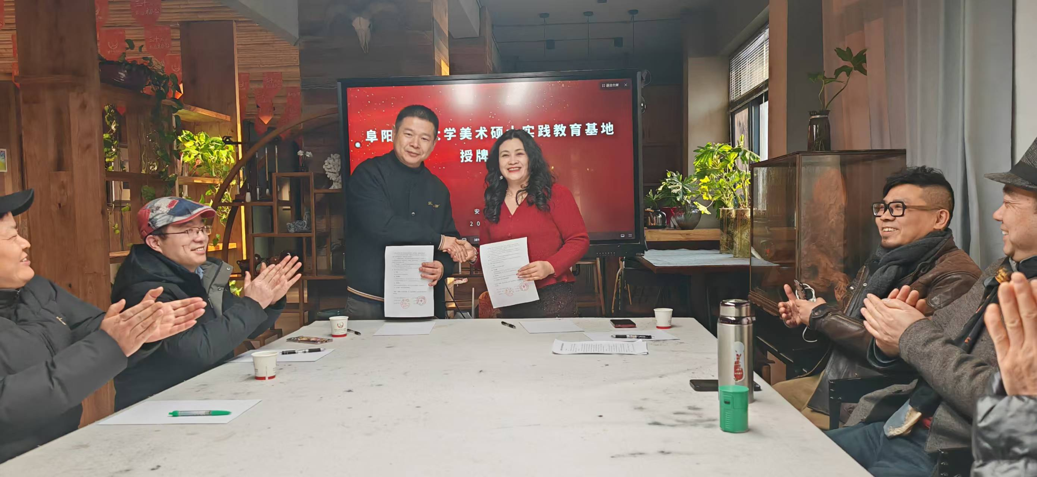 双方围绕课程建设、智慧教学、学科交叉与科研创新、人才培养与实习就业等领域展开深入探讨,在多个方面达成合作意向。座谈会后,双方正式签署合作协议,并举行“美术硕士实践教育基地”授牌仪式,标志着院企合作进入常态化、制度化新阶段。