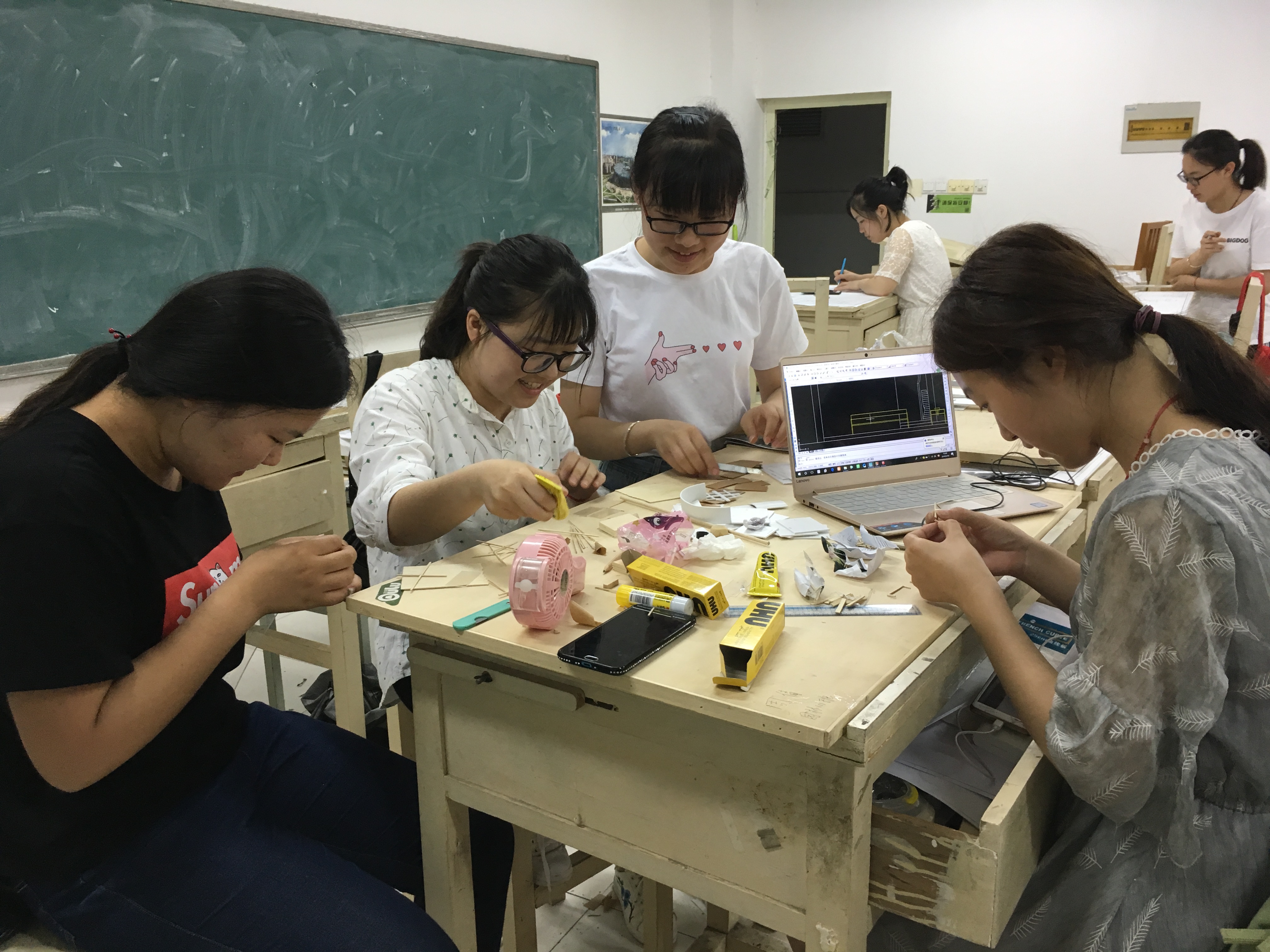 本次见习主要在实验E楼专业制图教室举行,根据制作案例的规模与复杂程度将学生分为2-9人不等的小组进行建筑模型的制作与搭建。同时,安排张之秋、耿秀婷、徐旸三位老师全天跟随点评,指出制作过程合理之处和不足之处,并在图纸阅读与软件操作方面给予指导。学生以水之教堂、李子林住宅、萨夫伊别墅、巴塞罗那世博会德国馆、成羽町美术馆、苏州博物馆等著名案例的CAD图纸与SU模型为素材,选取适当比例,采用雪弗板、TK板、椴木板、有机玻璃板、ABS板、UHU胶水等材料,完成景观建筑室内空间与场地环境的模拟建造。