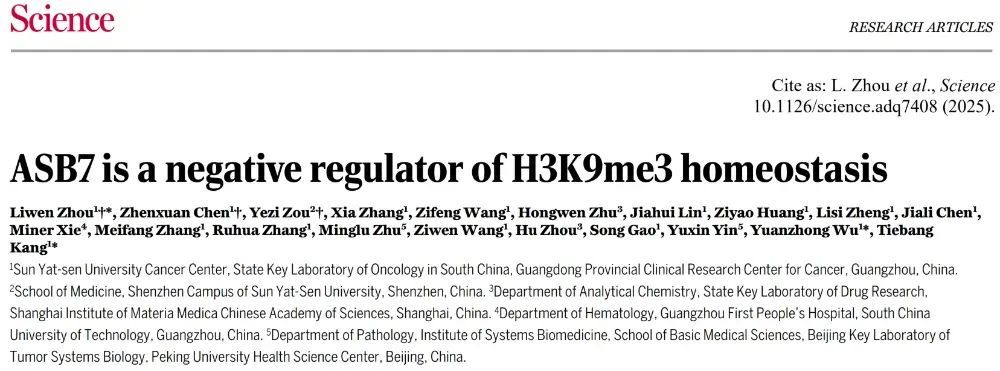 2025年5月30日,中山大学肿瘤防治中心康铁邦/武远众团队在Science发表了题为ASB7 is a negative regulator of H3K9me3 homeostasis的研究论文。该工作揭示了E3泛素连接酶CUL5ASB7发挥刹车器角色,通过细胞周期依赖性降解SUV39H1来保障H3K9me3在细胞周期中精准重建,进而维持异染色质在细胞增殖过程中的结构稳定。