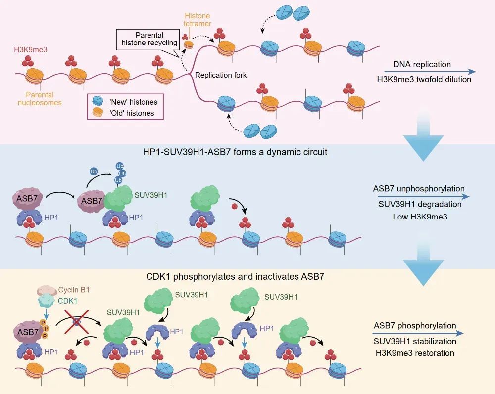 机制上,HP1通过其CSD结构域募集ASB7至异染色质,异染色质定位的ASB7可促进SUV39H1泛素化降解,并且该降解过程受到严密的细胞周期控制。在S期及G2期,ASB7处于非磷酸化状态,可有效结合并降解SUV39H1,从而限制H3K9me3过度修饰及延伸;进入有丝分裂M期后,CDK1-Cyclin B1迅速激活并磷酸化ASB7的底物识别结构域,进而阻断ASB7与SUV39H1互作,使得SUV39H1蛋白水平在M期达到顶峰,促进了H3K9me3在M期及G1期的重建,这一机制保障了H3K9me3在下一个S期开始之前精准恢复至初始水平。