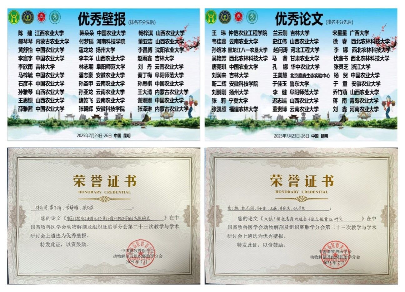 24日下午至25日上午,会议组织进行了动物解剖学与组织胚胎学两个分会场的学术报告与研讨。共有48名专家学者进行了专题学术报告。本次会议共收录了来自49所高校和科研单位的281篇教学与科研论文。其中,动物解剖学类论文112篇,动物组织学类论文139篇,动物胚胎学类论文25篇,教学改革类论文5篇。我院秦丁梅、林志朋两位同学获得“优秀”壁报证书。李健老师获得“优秀”论文证书。