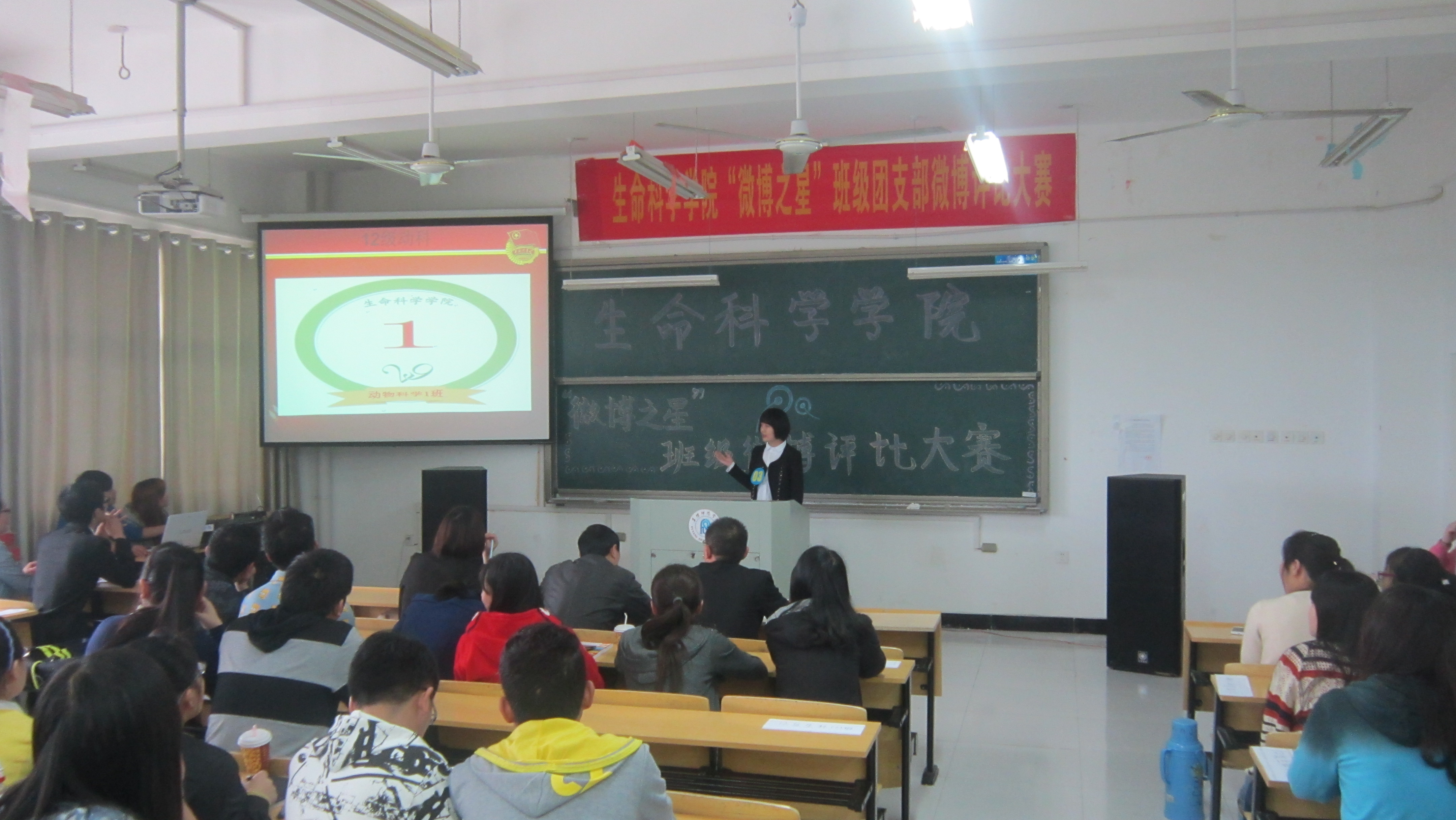 为进一步加强我院团支部建设,调动广大共青团员的积极性,探索新形势下适合当代大学生特点的团组织活动。2014年04月26日上午,生命科学学院“微博之星”班级团支部微博评比大赛实验D楼207教室成功举办。本次比赛的评委由生命科学学院丁彪老师、王魏根老师和王丛丛老师担任