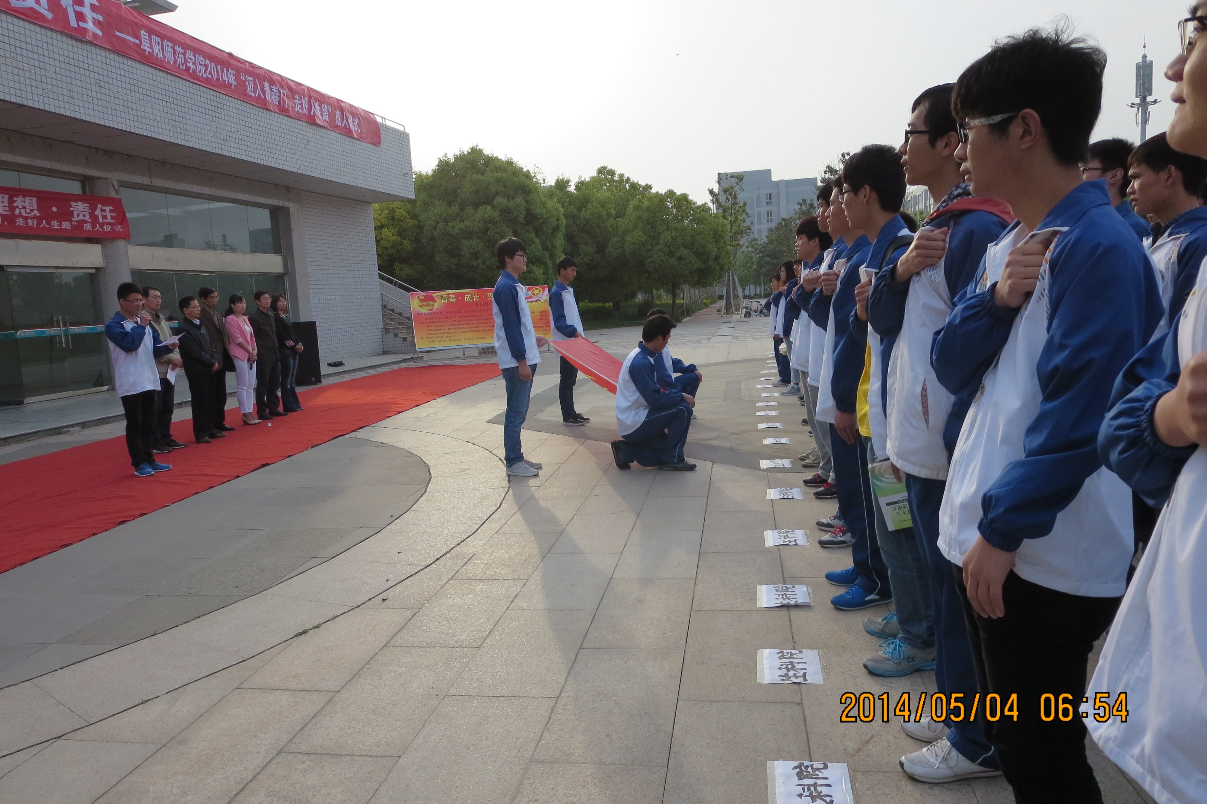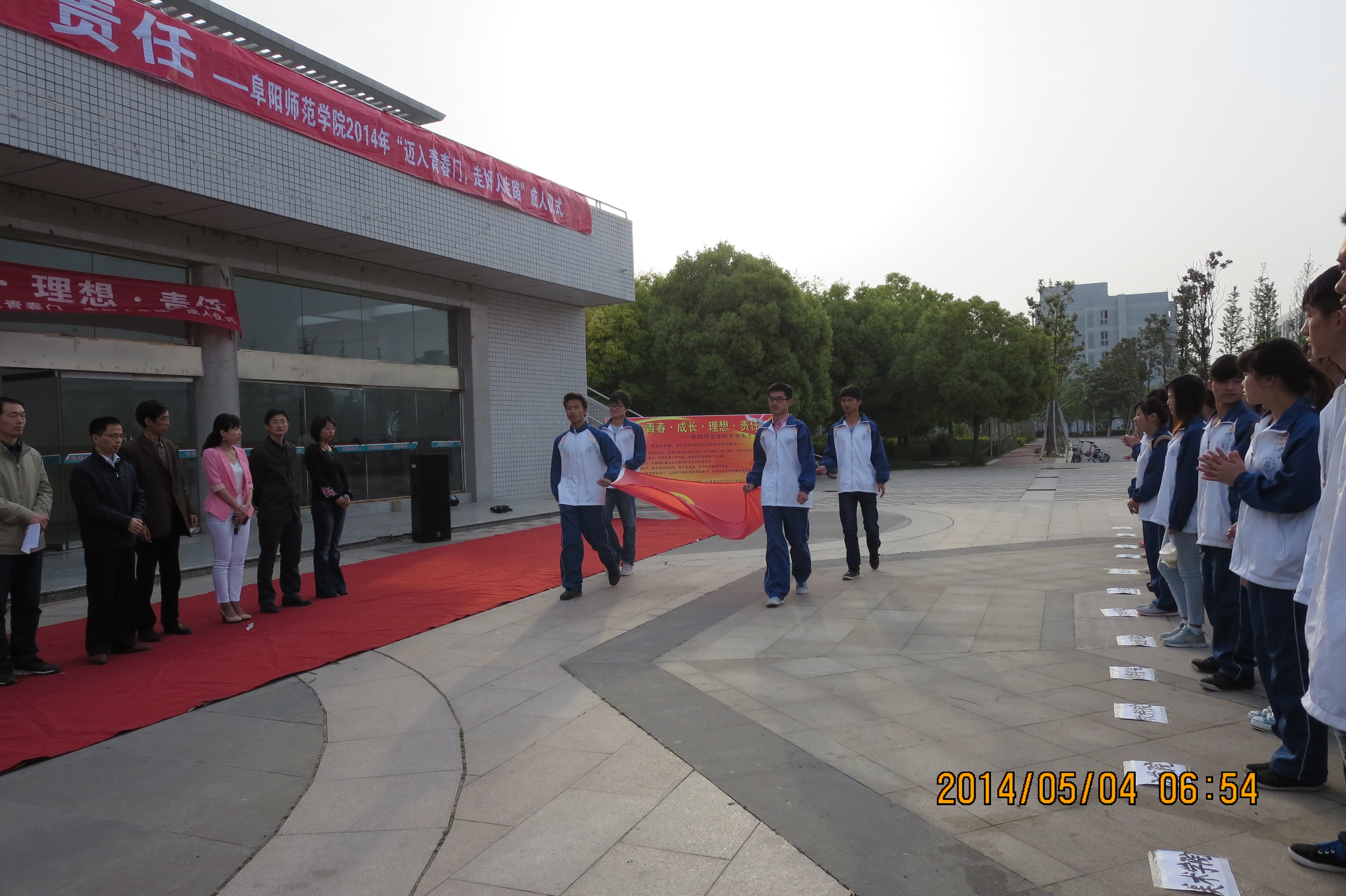 5月4日,由共青团阜阳师范学院委员会主办、生命科学学院团总支承办的阜阳师范学院2014年成人仪式在西湖校区综合楼前广场举行。校团委书记檀竹茂、副书记刘晓娟,生命科学学院党总支书记包春雷、副院长姜双林及各学院2013级新生代表出席了仪式。活动由包春雷主持。