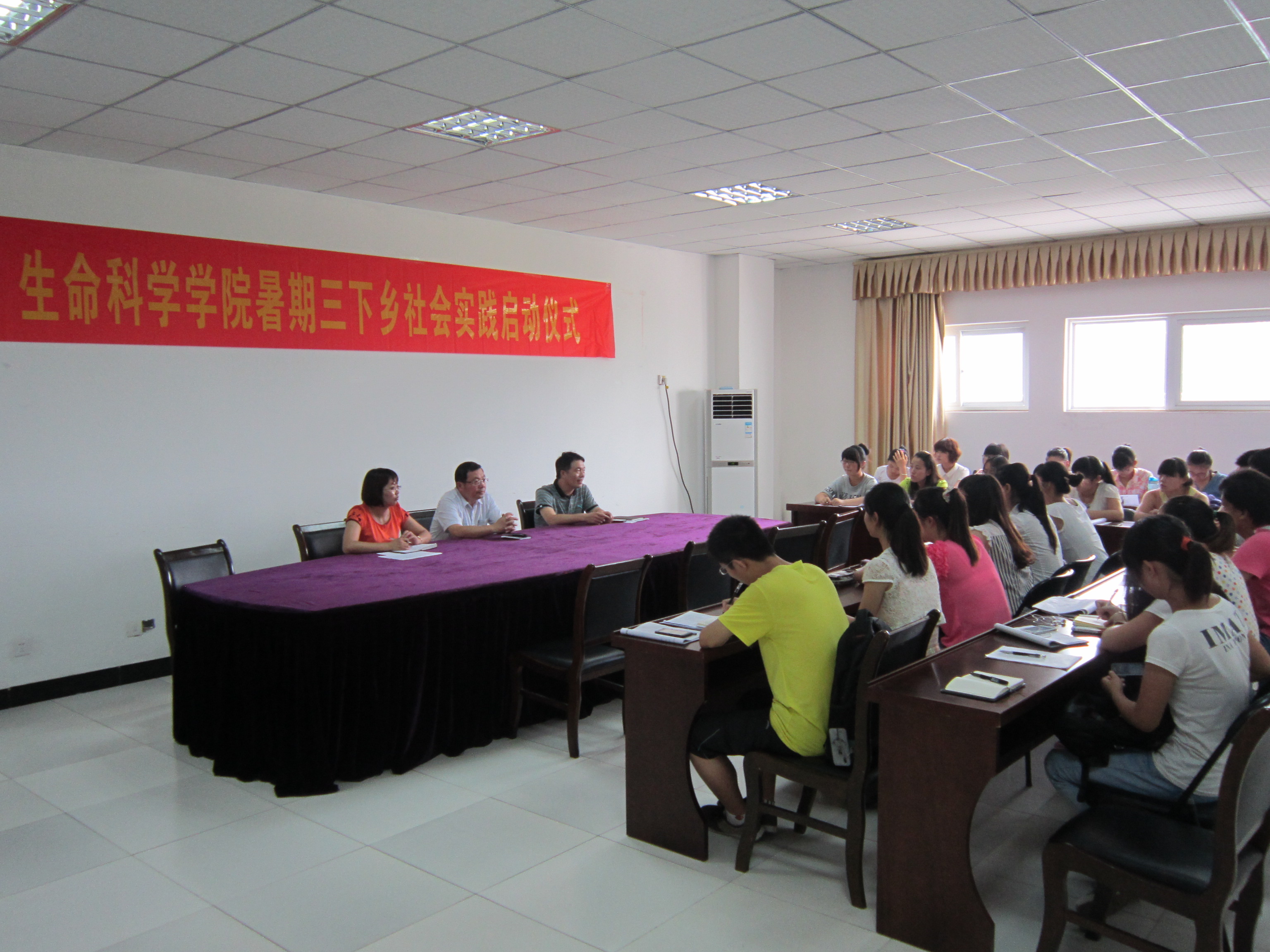 6月27日下午,生命科学学院2014年暑期“三下乡”社会实践活动启动仪式在E楼301会议室隆重举行。院长崔亚东、党总支书记包春雷、团总支老师王丛丛及33名志愿者参加了仪式。仪式由王丛丛主持。