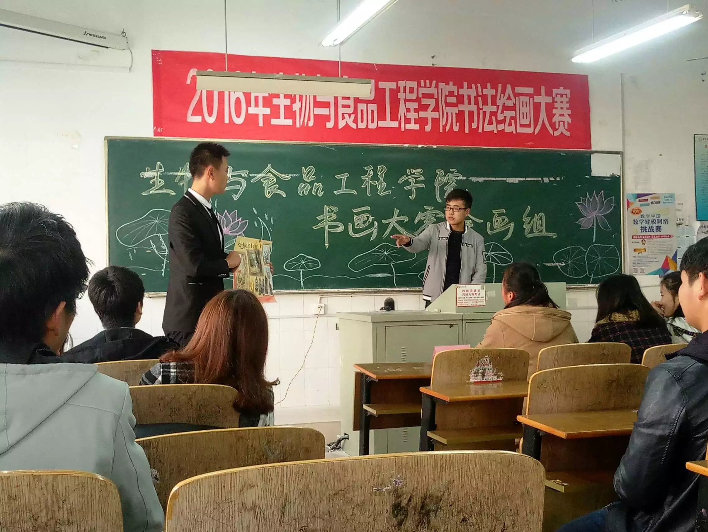 生物与食品工程学院书画大赛11月13日上午8:30于A楼206和A楼207成功举办。出席本次比赛的嘉宾及评委有刘相辉,李永霞,李芬,刘晓静,邓雪雪和夏清雅。本次活动由我院学生会宣传部主办。活动宗旨为丰富我院学生校园文化生活,充分调动我院学生的自主创造能力,鼓励当代大学生观察生活、感悟生活。活动分为绘画组和硬笔字组两组分别于A206和A207进行。
