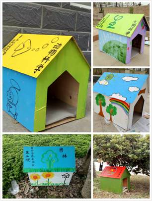 活动当天8点30,我们将之前准备的材料木板、锤子、米尺等,搬到九栋后操场附近的“情人坡”空地上。然后进行分工,男生开始锯木头,做小房子,女生在一旁辅助男生,测量木板的长度,并在做好的小房子上进行绘画,画上具有我们学院特色的图案。首先,在宣传部部员的帮助下,我们将之前准备好的两个房子先进行装扮。大家都全身心的投入到制作小屋中,很累但很快乐,随后,我们陆续做好了三个小屋,并进行了上色和画画。做好五个小屋后,我们于做好的精美的小房子,进行了合照留念。然后,我们将小屋子送到了小动物们经常出没的地方附近,并安放在树下。在此期间,我们充满了欢乐,在快乐我们的同时,也为小动物们准备了能给它们带来温暖的小房子。