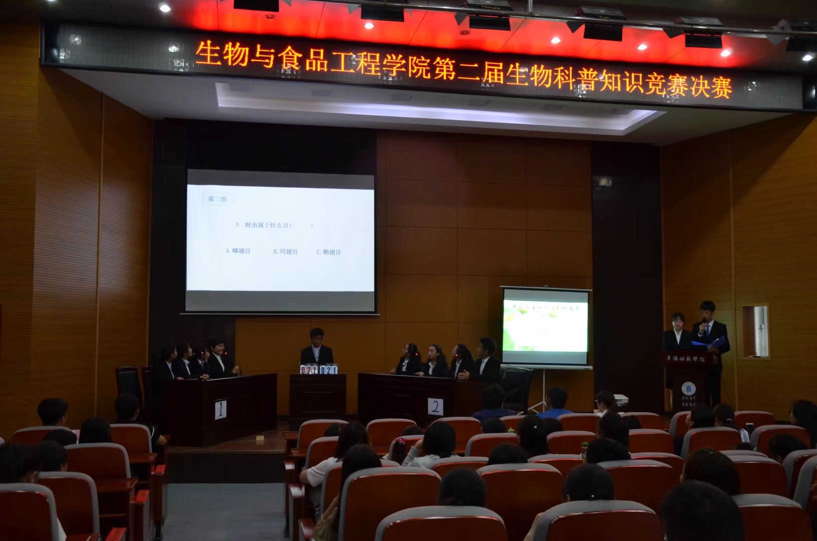 接着进行然后进入生物科普知识竞赛决赛。比赛分为专业组和非专业组,流程分为必答,抢答和论述三个部分。 每组激情地进行团队介绍,随后从容地进行第一环节必答题。随着抢答题的开始,全场的氛围也开始逐渐升温。有的团队信心满满,但没把握好时机,错过了解答的机会,也有的团队由于过于心急,导致犯规没能答题,队员们不免有些丧气,但又会很快振作起来,重新抢答!到了论述题时,团队中的每个队员都献计献策,议论纷纷,最后由代表将团队得出的答案阐述清楚,充分展现大学生的蓬勃朝气和昂扬向上的青春风采!赛后,李婷婷老师进行点评,他指出比赛的整个过程很精彩,同时对团队背后付出的努力予以肯定,但也提出比赛过程中存在的问题,比如有的团队没把握好时间,集体的协作能力还欠缺,没有将团队的潜力真正发挥出来,最后,她希望更多的学生能参与此类比赛活动中去,提升自己的各方面的知识与能力。