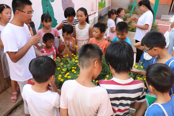 (图为志愿者带领孩子们了解花卉知识)